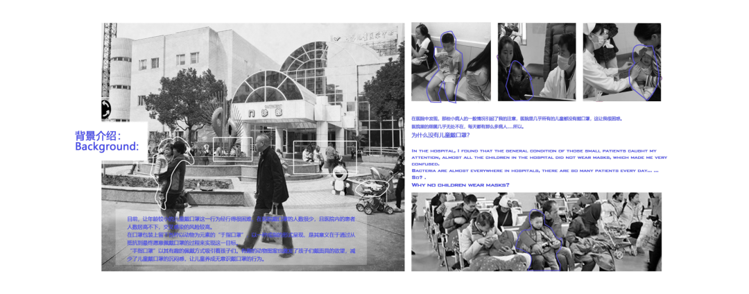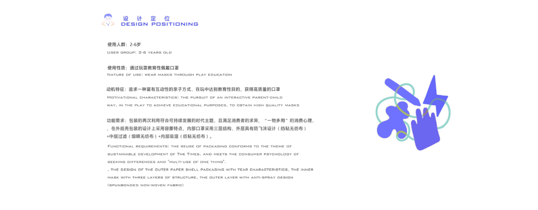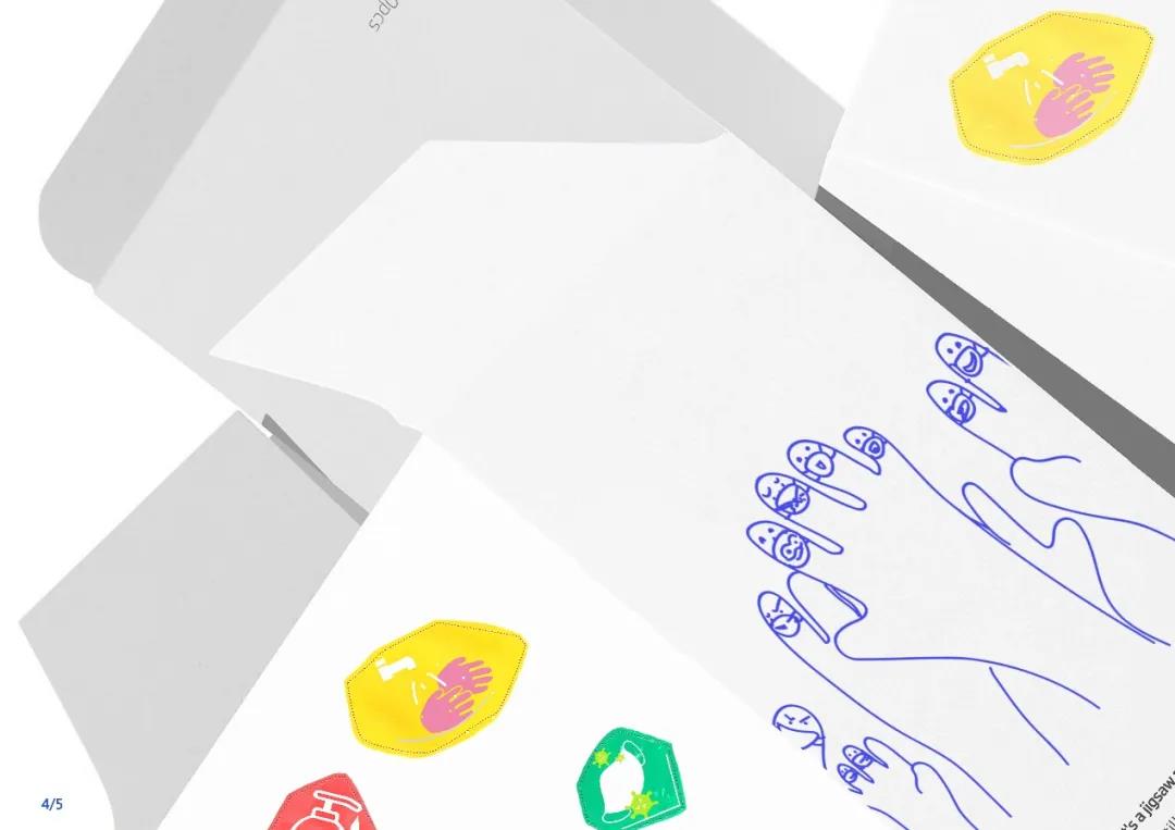 该设计从全球新冠疫情防控的角度出发,借助可持续与情感化设计理念,将“勤洗手”、“戴口罩”、“勤消毒”等防疫知识通过可视化与可玩性的趣味手指游戏融入到儿童口罩包装盒上,以此培养儿童日常戴口罩的习惯,并消减孩子们对口罩的抵触情绪与恐惧感,为全球新冠疫情防控贡献中国智慧。