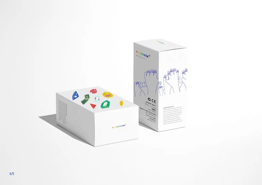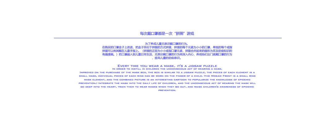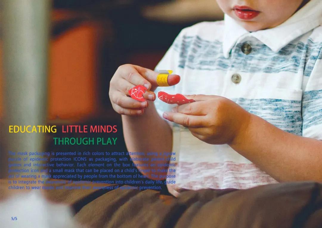The mask packaging is presented in abundant color to attract attention, using a jigsaw puzzle of epidemic protection ICONS as packaging, with elaborate parent-child games and interactive behavior. Each element on the box features an epidemic protection icon and a small mask that can be placed on a child's finger to make the act of wearing a mask appreciated by people from the bottom of heart. The purpose is to integrate the awareness of epidemic prevention into children's daily life, guide children to wear masks and improve their awareness of epidemic prevention. Children as the vulnerable groups on earth, We should pay more attention to the harmony between children and the environment.