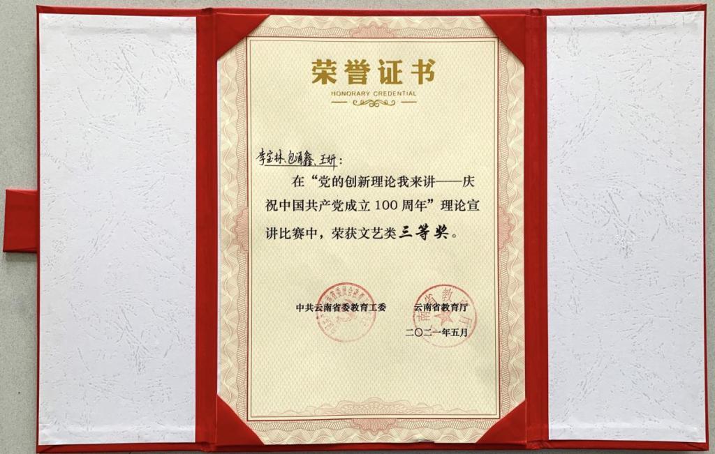 李宝林、包涌鑫、王妍三位同学的《闪亮的名字》获得文艺类三等奖。