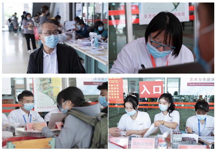 迎新工作现场,工作组成员各司其职,积极负责宣传、讲解研究生新生报到程序、引导研究生新生办理报到手续,提供咨询服务;完成迎新系统注册、学历查验、助学贷款回执收集、党、团组织关系转接、新生证、卡发放;按照学校有关规定积极引导研究生新生“绿色通道”网上办理程序,组织协调新生在迎新系统中审核申请,确保“绿色通道”顺利通过。