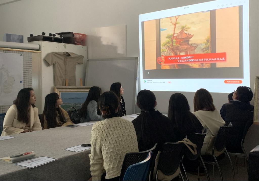 参会人员首先一起观看了电视栏目《盛世典藏》,该栏目对本次画展进行了全方位多角度的报道和详细的介绍,再一次感受画展的热烈气氛和优秀艺术作品带来的感染力。随后周峰越副校长就此次策展办展的心得体会与在场师生进行了亲切的交流。他强调了大学美育教育的重要性,提出美的事物会给人力量,帮助人们度过困境,希望让这些油画通过画展被更多人看到,让这些美的事物给予更多人温暖与力量。