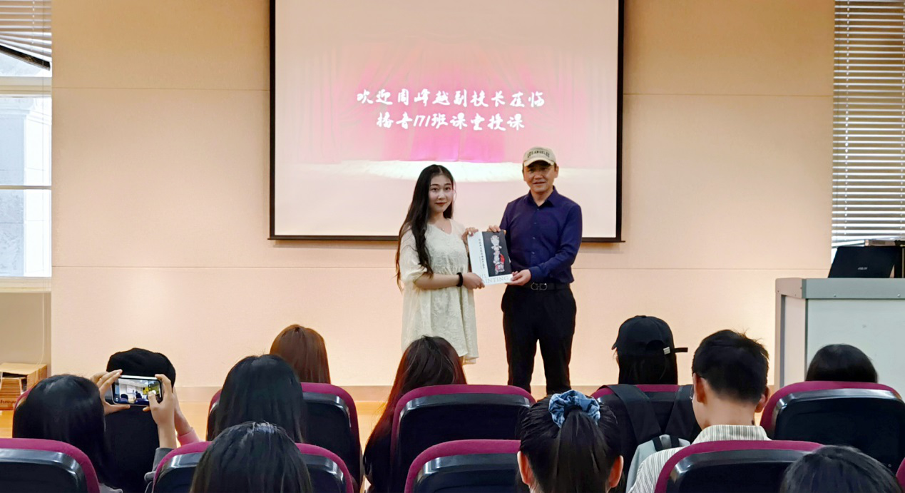 周峰越副校长首先来到播音与主持艺术专业17级短学期实践课程《大型节目策划与主持》的课堂,看望正在授课的教师。随后,周副校长为同学们上了一堂精彩的美育课。周副校长从苏格拉底、柏拉图讲起,用生动的案例阐述了语言和文字、艺术的关系,分析了美学修养在播音主持工作中的重要作用。周副校长勉励同学们,要多读书,读好书,要努力提升自己的学养,从而真正提升自己的专业水平。课堂上,周副校长还向同学们赠送了自己主编的精美画册。周副校长幽默生动的授课风格和丰富多彩的授课内容深深打动了同学们,课堂气氛十分活跃。同学们表示,非常高兴能听到周副校长的现场授课,同学们收获非常大。