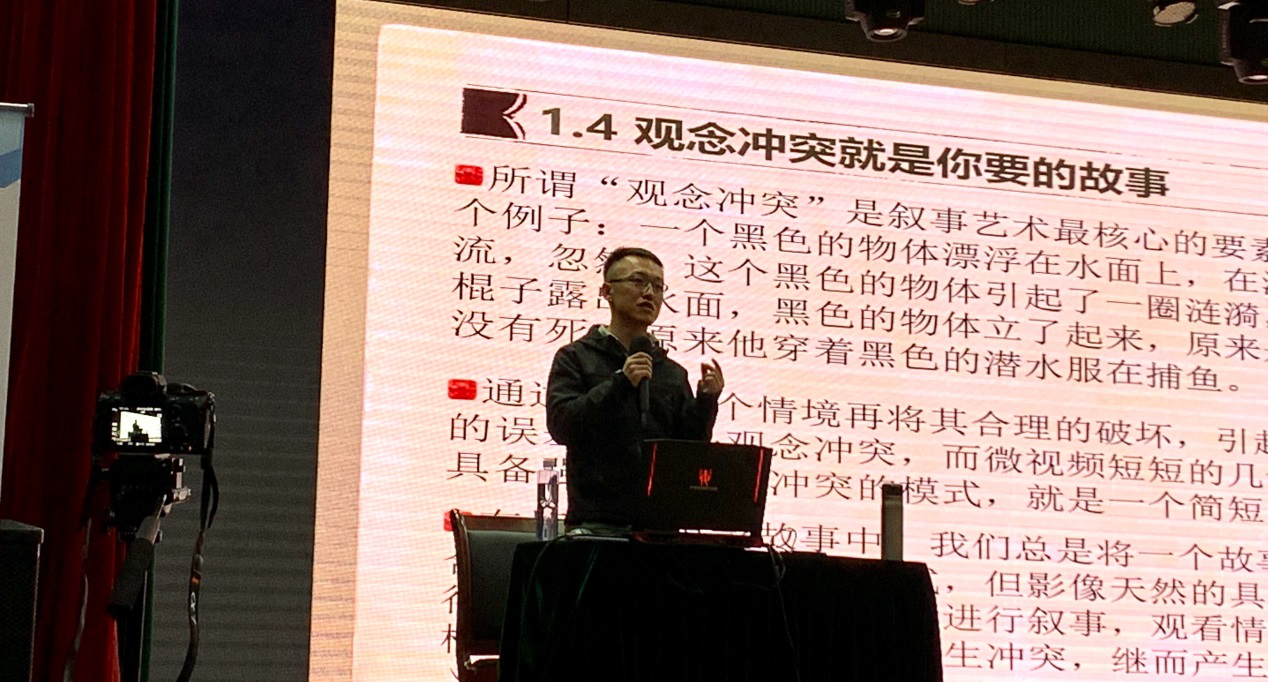 讲座中,倪崑皓老师从电影的发展历程讲起,结合若干案例,深入浅出地阐释了如何运用导演思维进行短视频作品的创作。倪老师的讲座风趣幽默,知识性强,赢得了全场师生的阵阵掌声。
