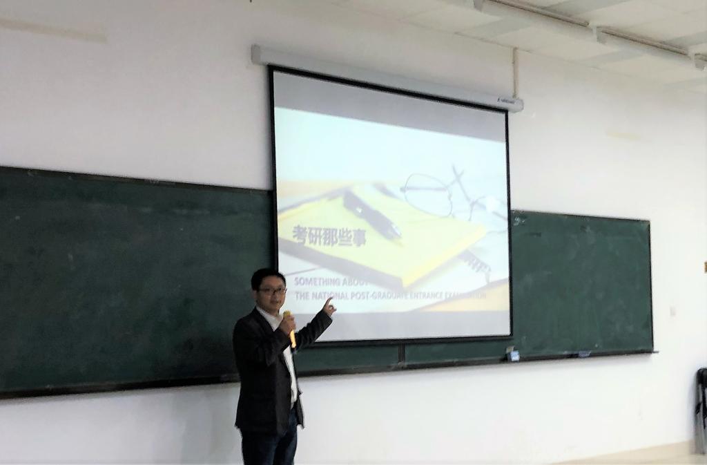 动员会上,崔颖老师结合自己的求学经历,围绕着“考研是什么、为什么考研、怎么复习”三个方面开展讲座。崔老师对“考研报名流程、考研科目详情、报考院校选择”等情况做了详细介绍和说明,他指出:“大多数研究生的英语能力更突出、学科知识体系更完善、毕业后有更好的择业选择和更明晰的职业规划。”这给处于迷茫状态的2017级学生指明了方向,也为准备考研的同学打了一针强心剂。崔老师还强调:考研复习是一场“个人攻坚战”,大家首先要正确的评估自己,定一个力所能及的目标并搜集学科、专业的相关信息,不要盲目从众,适合的才是最好的;其次,要制定科学合理的学习计划,并坚持不懈地努力,实事求是的投入到学习中,心无旁骛;再次,大家要与各位教师积极沟通,教师会根据学生实际情况给出科学合理的建议,耐心的为同学们答疑解惑,并为学生提供一些复习的方法和思路,最后,崔老师还把自己的联系方式留给大家,欢迎大家及时交流、沟通。