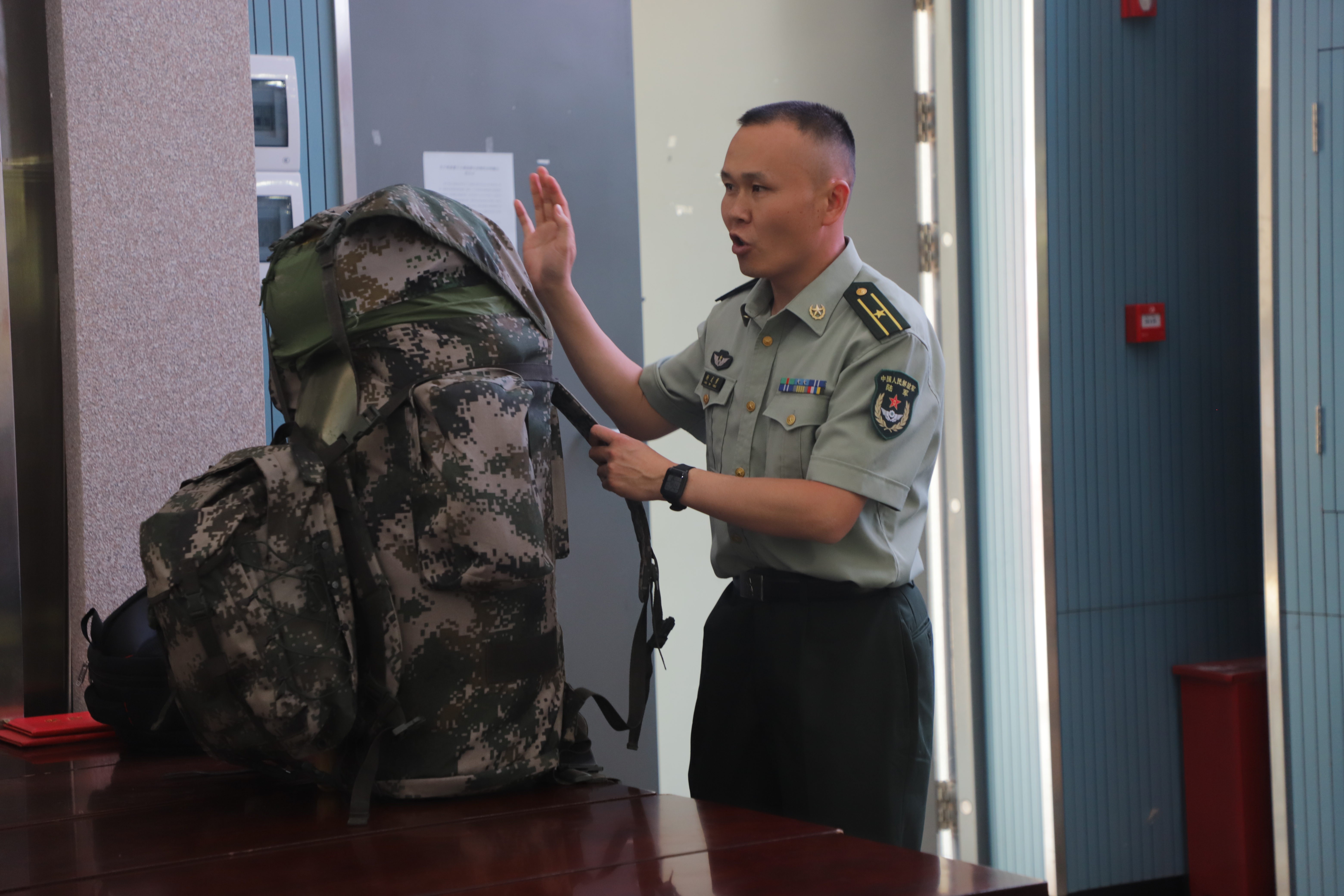 会后,杨式勇少校向学生们展示了他的携行具,并邀请同学们上前参观,播音与主持艺术181赵鑫同学参观体验之后表示对军旅生活充满了向往之情。