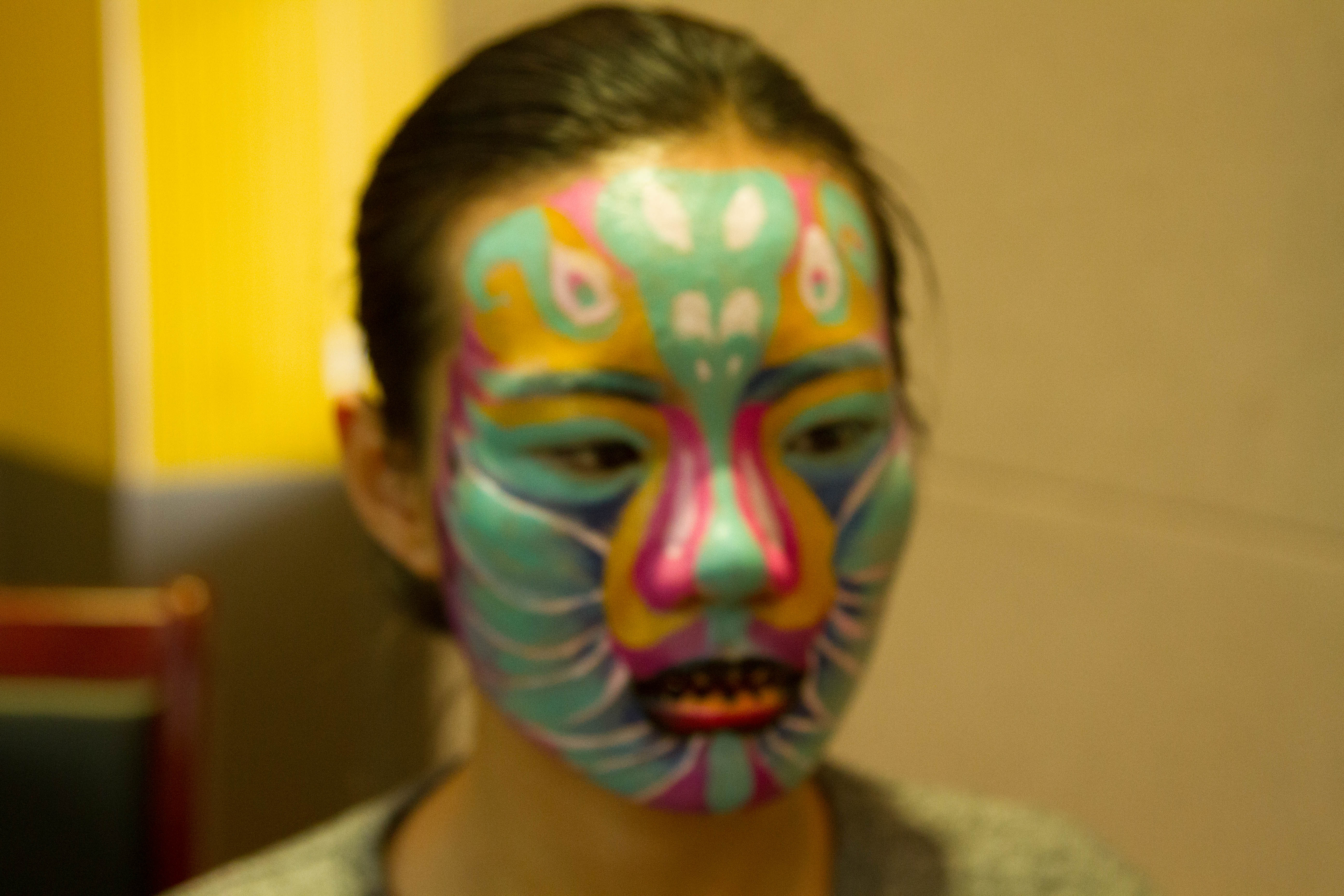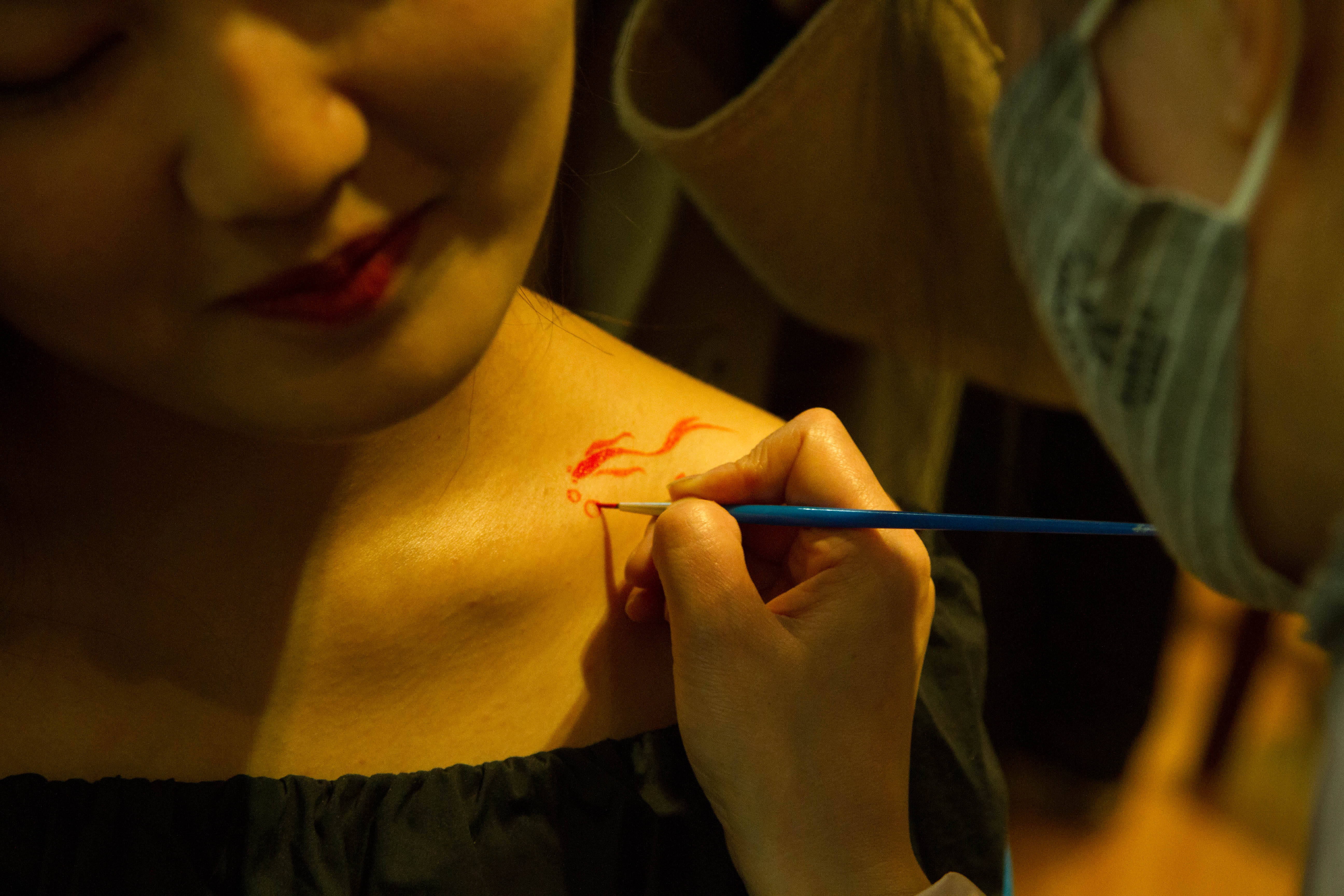 本次课专门选用人体彩绘无毒颜料和卸妆用品。上课班级的五位同学自愿报名作现场模特。教学过程主要通过专题介绍,PPT案例展示,课堂讨论,师生分组交流等环节,使大家对人体彩绘有所了解,并当场合作完成局部彩绘造型。最终,官鸿老师将中国传统的脸谱与现代艺术相结合,为陈治君同学创作出绚烂多彩的面部彩绘;李富娜老师为李鹂璞同学进行了手臂凤凰和面部牡丹的彩绘,又为孙琳钧同学绘制了锁骨部位的红色锦鲤;研究生刘文娇为贾芃洁同学在肩颈部位彩绘了一只惟妙惟肖的梅花鹿;梁劲芸老师依照廖发升同学的意愿,在其手臂上彩绘出一串花藤。其他同学在观看示范之后,大大增强了共同探索、相互练手的积极性。大家临时配搭,沟通合作,相互尝试在面部、颈部、手臂等局部进行了彩绘练习。课程现场还吸引了本院不同部门的多位老师前来观摩交流。