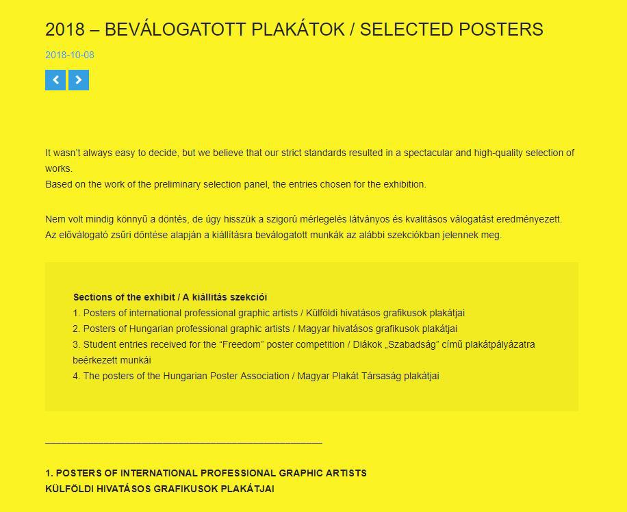 布达佩斯国际海报节由匈牙利海报协会主办,每两年举办一次,旨在庆祝海报艺术节,并展示海报在现代视觉设计中的作用。大赛无主题限制,要求近两年内创作的作品,每人限投3幅,由国际评审委员会评审。获奖作品于2018年11月在特斯拉(布达佩斯七区,KZANZZY UTCA 21)展出。本次比赛经过严格评审,获奖的作品来自24个国家地区,共有150件优秀作品脱颖而出,杨吟川老师的2件作品入选证明了昆明理工大学设计学科的实力。