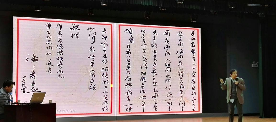 讲座中,胡老师提到他几日前参观闻一多先生的篆书--位于云南师范大学的“国立西南联合大学纪念碑”,以碑上“国”字缺少了竖笔抛出“题眼”,表达了文人志士对国土统一的愿望和做出的努力,同时点出“联”字是中国人文核心,从而引出开篇的重点。并讲述在那战火纷飞的年代,三校被迫两迁至昆明,讲到此处,他的演讲越发慷慨激昂,为大家解析了篆书的字形与排布,同时言语中透出他对国家统一热忱的期望。胡西林老师的情感透过语言像浪花一样激荡着同学们的心灵,同学们被他的热情感染掀起一片片掌声。这个插曲也成了这次讲座的画龙点睛之笔。