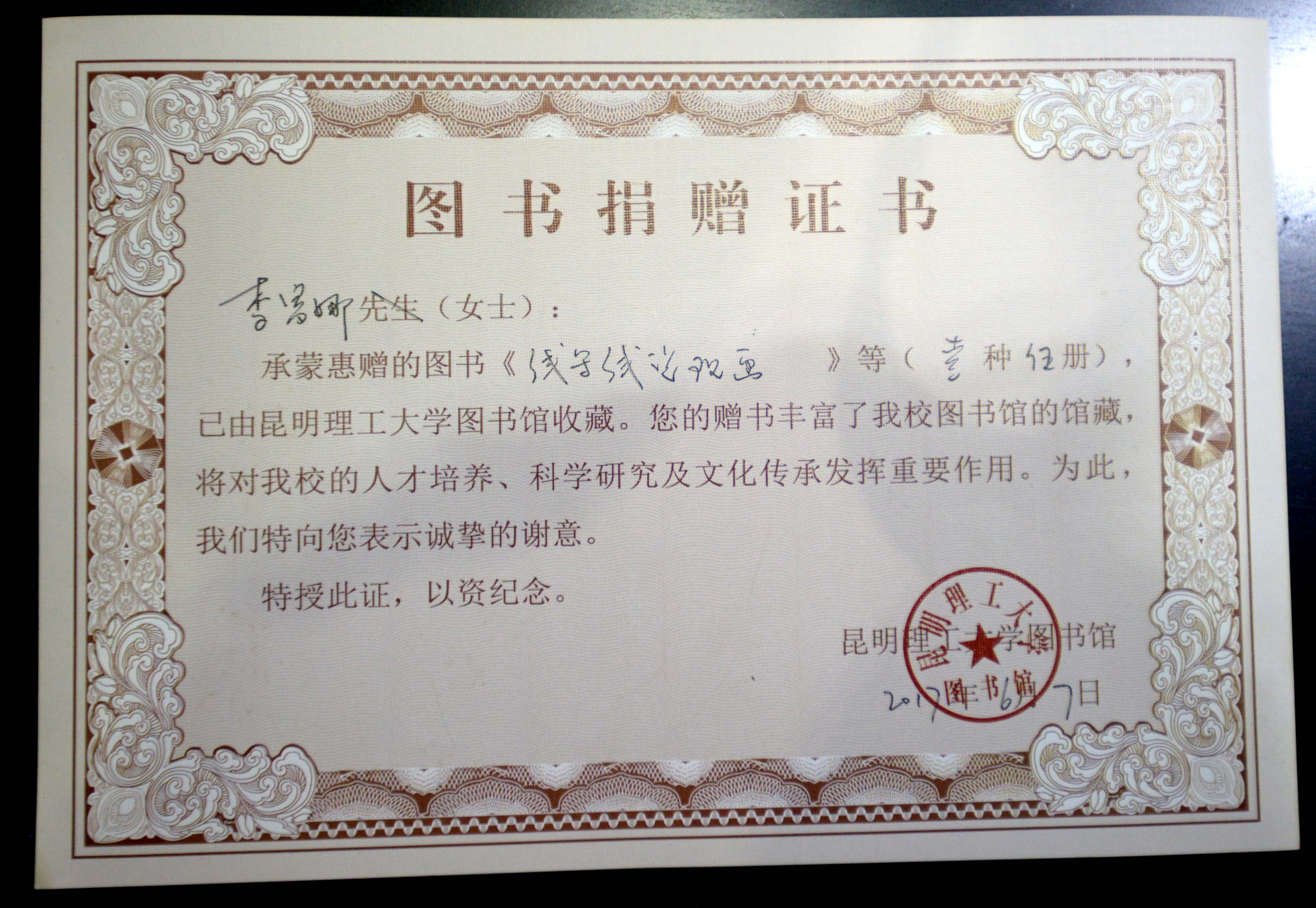 近日,牛牛游戏下载 美术系李富娜副教授收到了昆明理工大学图书馆的捐赠证书。李富娜副教授著作的书画作品集《线写线说现画》一书,于2017年4月由云南大学出版社正式出版。