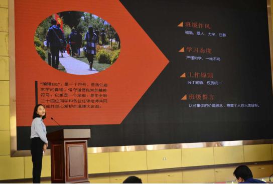 在答辩会现场,陈泽霞同学就编辑131班班级建设,班级学风建设,社区文化建设,素质教育及文体活动开展,校园科技文化活动和学科竞赛参与以及课外实践活动等方面进行了一个全面的介绍。该班秉承诚品、爱人、力学、日新的班级作风;严谨治学、一丝不苟的学习态度;分工明确、权责统一的工作原则;以“认可集体的价值理念,尊重个人的人生目标”为班级誓言,形成良好的学风和踏实的工作态度,团结合作、互帮互助的班级生活氛围。