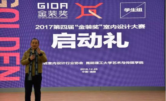 云南省室内设计行业协会会长罗正将先生在致辞中,向大家介绍了云南省室内设计行业协会的概况及“云南设计·名师讲坛”系列活动深入校园的意义,并详尽的介绍了2017第四届“金装奖”室内设计大赛(学生组)的赛事宗旨及流程。他说:“‘金装奖’室内设计大赛是云南省室内设计行业协会倾力打造的面向全云南省设计师,秉承公平、公正、公开、公益的赛事宗旨。往届赛事收到稿件数百套,并在国内国际专家评委的评审下每届角逐出64套获奖作品,且结集成册,录入《云南装饰设计年鉴》,成为云南设计界的一张‘名片’。此次将学生群体独立设组,旨在提高同学们的参赛热情,有效为同学们搭建起相互促进交流的平台。”最后,罗会长强调,参赛只是手段而非目的,真正的目的是让同学们在参赛中不断学习,收获成长。