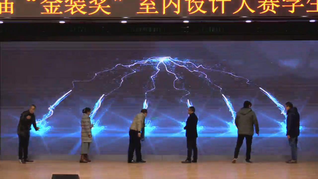 装饰艺术设计教研室谢舰锋主任、云南省室内设计行业协会罗正将会长、云南省室内设计行业协会学术委员会主席许咏峰老师上台共同将手掌印上启动荧幕,随着屏幕中闪现出的花火,2017第四届“金装奖”室内设计大赛“学生组”正式启动。
