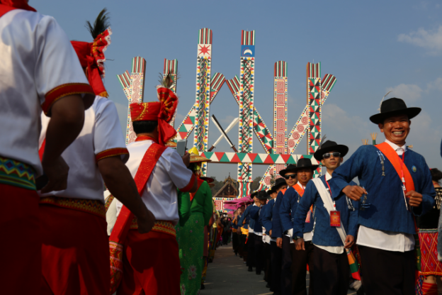 2月11日上午,云南德宏傣族景颇族自治州芒市地区目瑙纵歌节在欢快的鼓点声中拉开了序幕,来自各地的民众在接下的两天时间里踏着同一鼓点起舞,欢庆佳节。此次目瑙纵歌节持续2天,举行4场万人之舞。