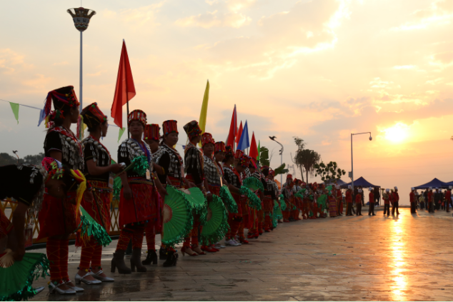 目瑙纵歌即将开始前,从芒市各乡镇选拔出来的歌舞队准备迎宾(彭慧颖 摄)