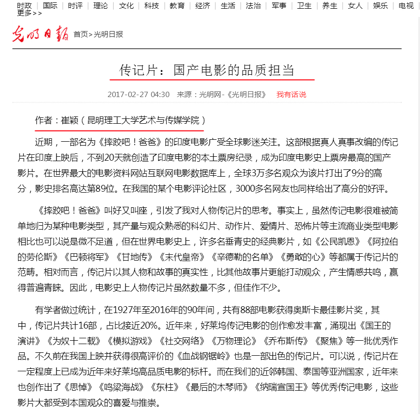2017年2月27日出版的《光明日报》,在第12版全文刊登了牛牛游戏下载 教师崔颖博士的署名文章《传记片:国产电影的品质担当》。