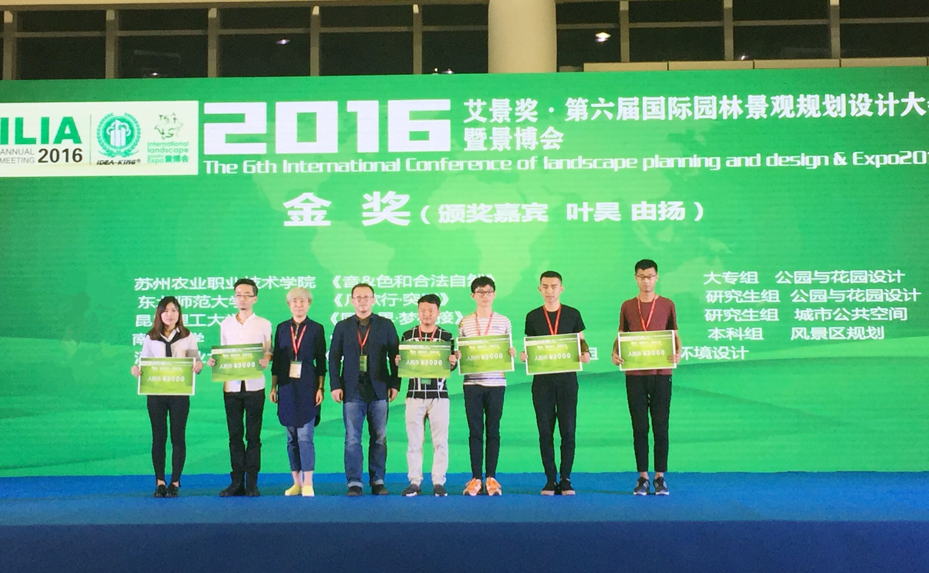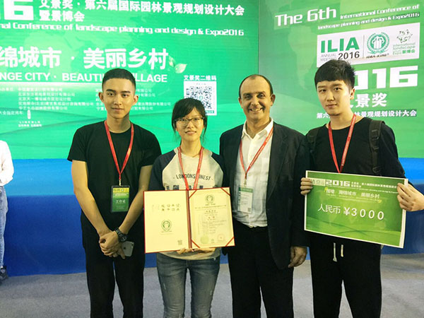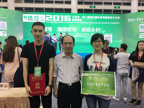 颁奖盛典上,国务院学位办风景园林硕士专业学位指导委员会副主任、全国风景园林本科专业教育委员会副主任、国际景观生态学会理事、美国景观规划设计学会终身荣誉会员(华人唯一)、上海风景园林学会副理事长及风景园林教育分委员会主任、同济大学建筑与规划学员景观学系主任、博士生导师刘滨谊教授,住房和城乡建设部风景园林专家、国际园林景观规划设计行业协会主席、北京林业大学博士生导师唐学山教授等,都欣然与我校获奖学生合影。