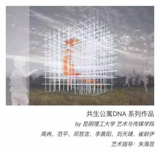 朱海昆副教授带领研究生周冉、范平、邓哲妍、李晨阳、刘天靖、崔龄伊等6名女同学,经过短期、紧张的构思,带着“共生公寓DNA系列”参展。作品体现的主题思想是:世间万物,包括我们生存的空间环境和活跃的思想,都兼有最基本的基因;独立的基因始终存于最基本的空间构架中,我们应该让地域、环境、物质、民族、宗教和哲学思想携手共荣,使我们的生活始终在每天的“正午”。