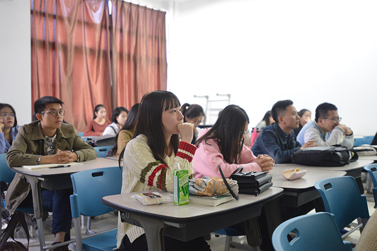 共有11名研究生带来了自己的论文。首先,由每位同学从作品或论文选题、结构、创新点等方面进行了PPT陈述,随后,点评嘉宾对同学们的论文进行了点评。四位点评嘉宾都是在学术研究和教学领域有很高的造诣的教授、博士,他们认真了解每位同学的作品和论文,针对具体的问题,提出了很多有见地的看法和中肯的修改意见。讲台上的研究生讲得绘声绘色,台下的老师和同学听得认真仔细,老师的点评让同学们眼界大开,师生还围绕选题进行了深入的交流,会场氛围热烈而融洽。