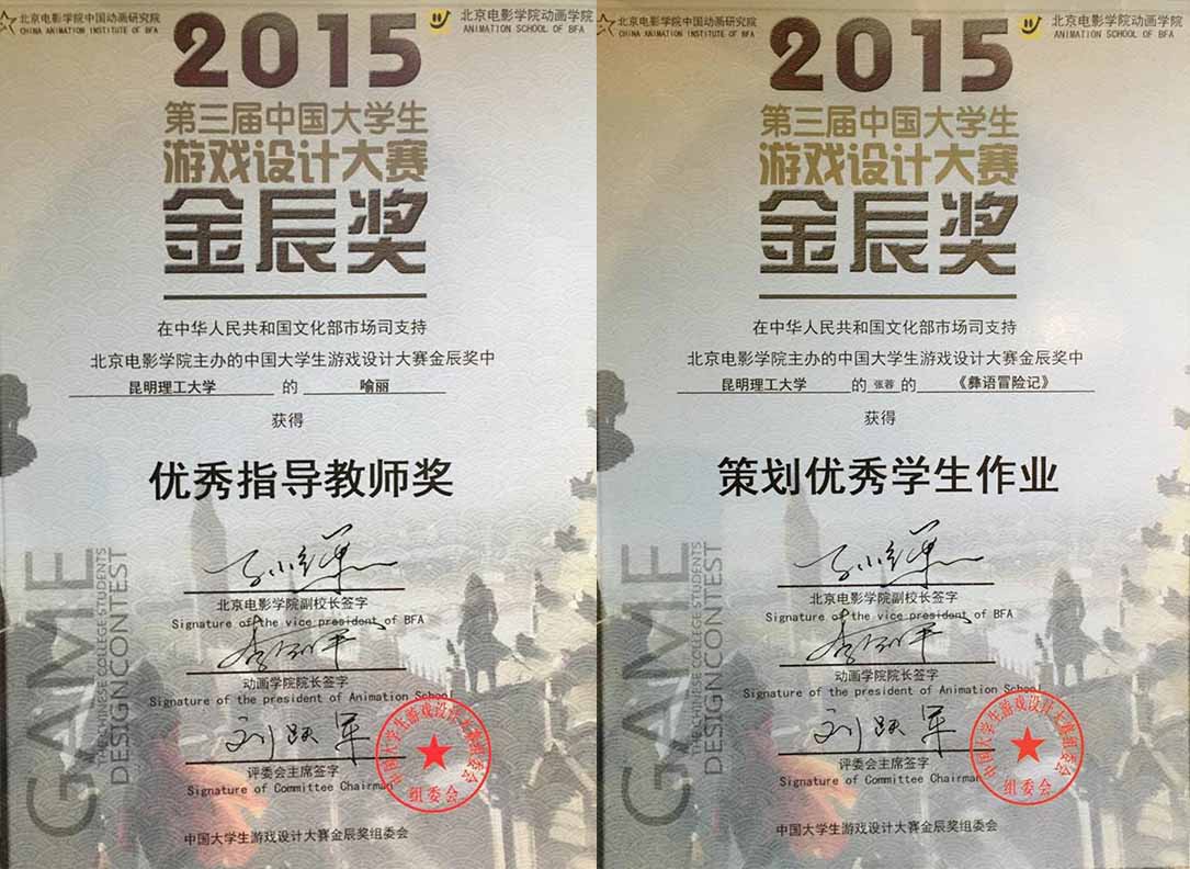 首次组织作品参赛就取得了优异成绩。2013级艺术设计专业研究生舒浩、杨燕翔作品《鱼跃龙门》荣获了优秀游戏UI设计奖;2015级设计学专业研究生张蓉作品《彝鱼冒险记》、艺术设计专业研究生郭悦作品《昆明山海经之龙九子》荣获了优秀学生作业奖;视觉传达设计系主任喻丽老师荣获优秀指导教师奖。