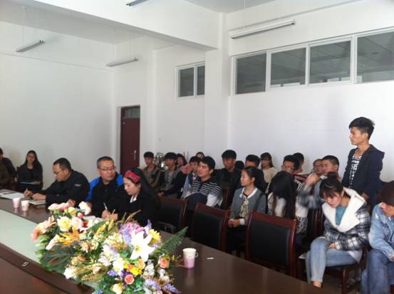 会议室召开了本学期的教学工作座谈例会。出席本次会议的有:学校教务处教学科科长杜伟老师、主管教学的副院长王勇老师、党委副书记严波老师、教务办主任李雪樱老师、学工办主任郝儒良老师。以及全院的各专业的系主任,11级、12级、13级、14级各班班长和学习委员与会。会议在副院长王勇老师的主持下,围绕各年级各班在教学方面遇到的问题展开讨论。
