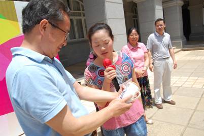 ,她就把这个精美的设计作品赠给了周书记。作品是个精巧的杯子,杯子外侧以周书记的肖像为主体开展设计。周书记看后很高兴地收下了这个礼物。