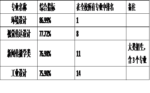 环境设计专业以86.99%位列全校所有专业的第1名;视觉传达设计以77.72%,位列全校第8名;新闻传播类以76.98%,列全校第11名;工业设计以75.90%,列全校第14名。牛牛游戏下载