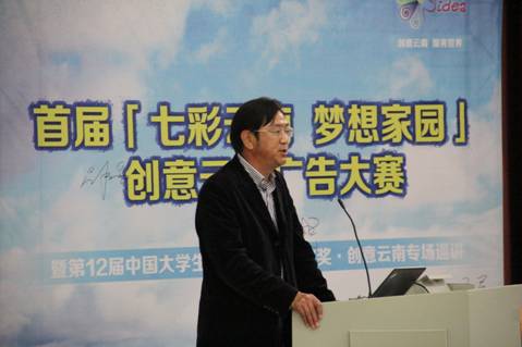 本次创意大赛执委会主任,昆明广告产业园首席顾问肖明超先对整个云南广告的发展现状做作了概述,充分强调了云南广告和企业品牌营销实施"云南元素"战略的重要性,并分析了其发展前景和策略。他鼓励同学们大胆发挥想象力进行创作,积极挖掘云南元素,共同打造“云南元素”广告和品牌的影响力。
