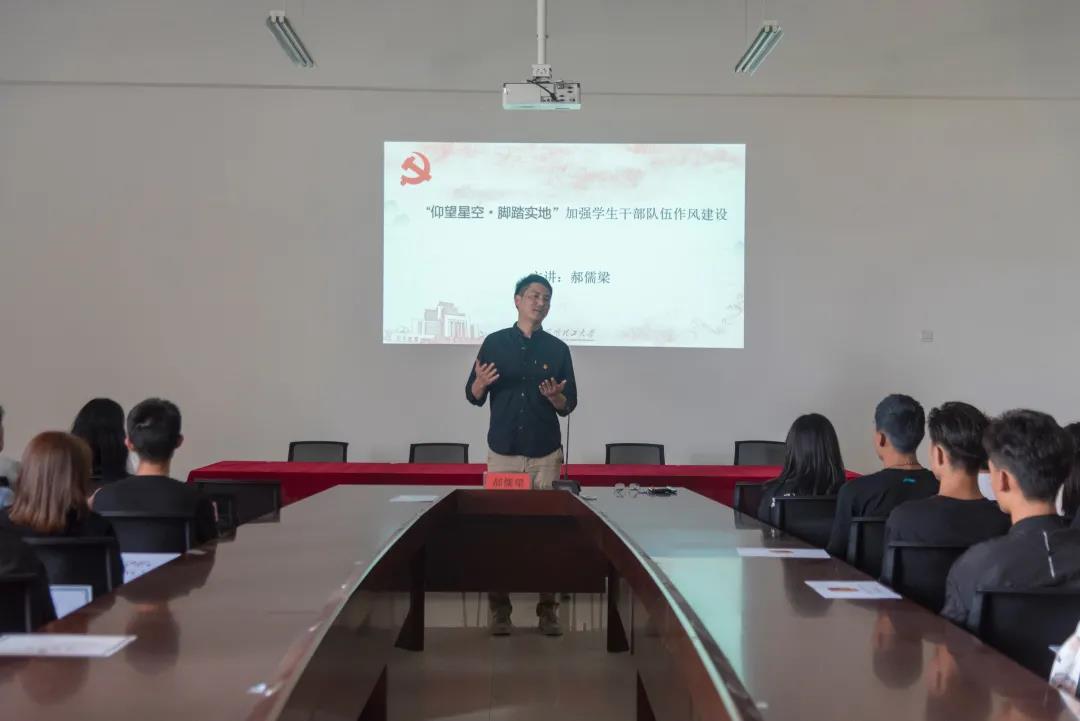 第二讲由郝儒梁老师讲授。郝儒梁老师以“仰望星空,脚踏实地”加强新时代学生干部的作风建设为题,主要讲了要加强学生干部的作风建设,践行初心和使命,学习和继承党的三大优良作风,即理论联系实际、密切联系群众、批评与自我批评。郝儒梁老师还给学生干部分享了工作经验,并要求学生干部要脚踏实地地做好自己的相关工作,全心全意地为人民服务。