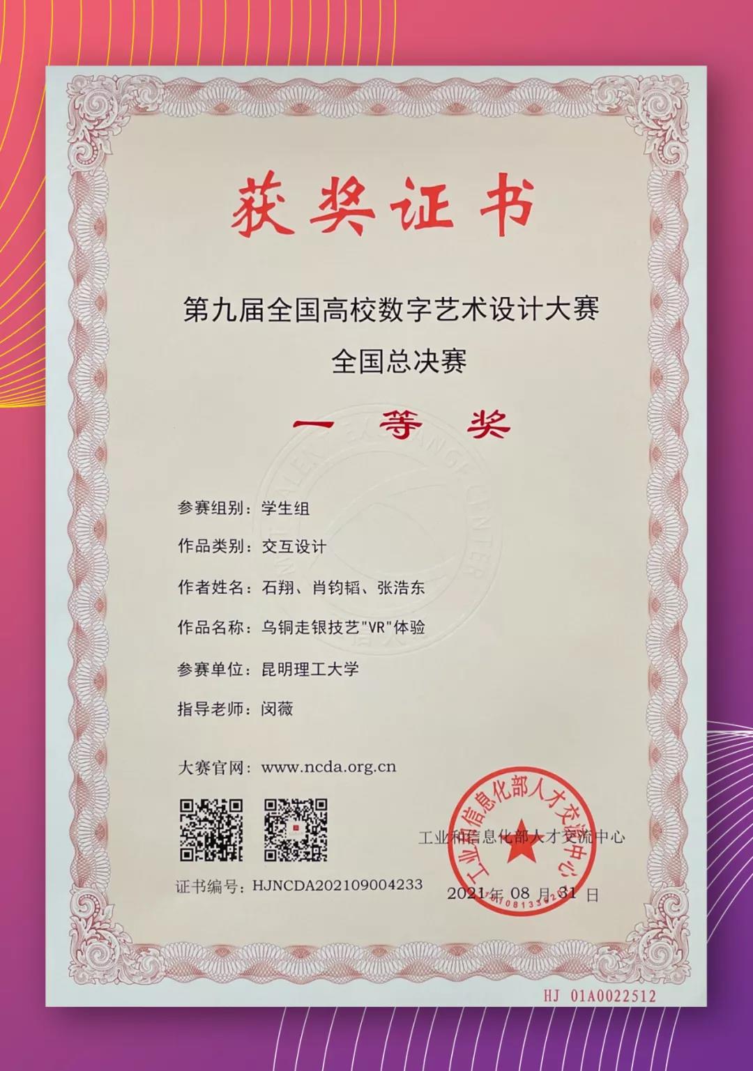 在入学之后我就在思考自己到底想要做什么样的设计。就在这时我发现了VR科技逐渐成为了数字媒体专业的新兴科技,在那一刻我就认识到我想做的就是VR方向的技术了。而在接触了这门技术之后我看到了它未来无限的可能性;毕业设计开题之后我就已经确定了要结合云南地区的非物质文化遗产乌铜走银与VR技术相结合,成功设计出立于云南本土的非物质文化遗产的宣传虚拟数字化VR传承馆。并获得了全国高校数字艺术设计大赛的全国一等奖。至此之后我也继续向着更优秀的数字媒体方向的设计师不断前进着。