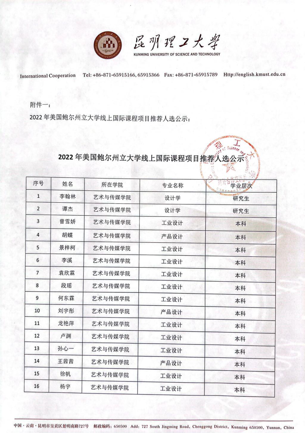 在此背景下,为推动昆明理工大学工业设计的专业发展与国际化建设,我校特面向该专业范围遴选30名优秀学生参加美国鲍尔州立大学( Ball State University )线上“工业生产技术”国际课程学习。
