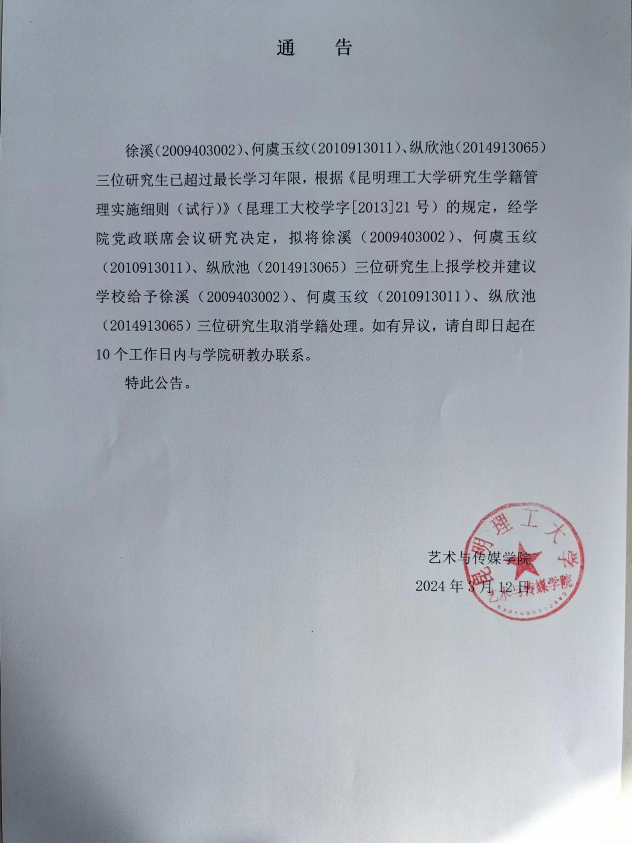 徐溪(2009403002)、何虞玉纹(2010913011)、纵欣池(2014913065)三位研究生已超过最长学习年限,根据《昆明理工大学研究生学籍管理实施细则(试行)》(昆理工大校学字[2013]21号)的规定,经牛牛游戏下载