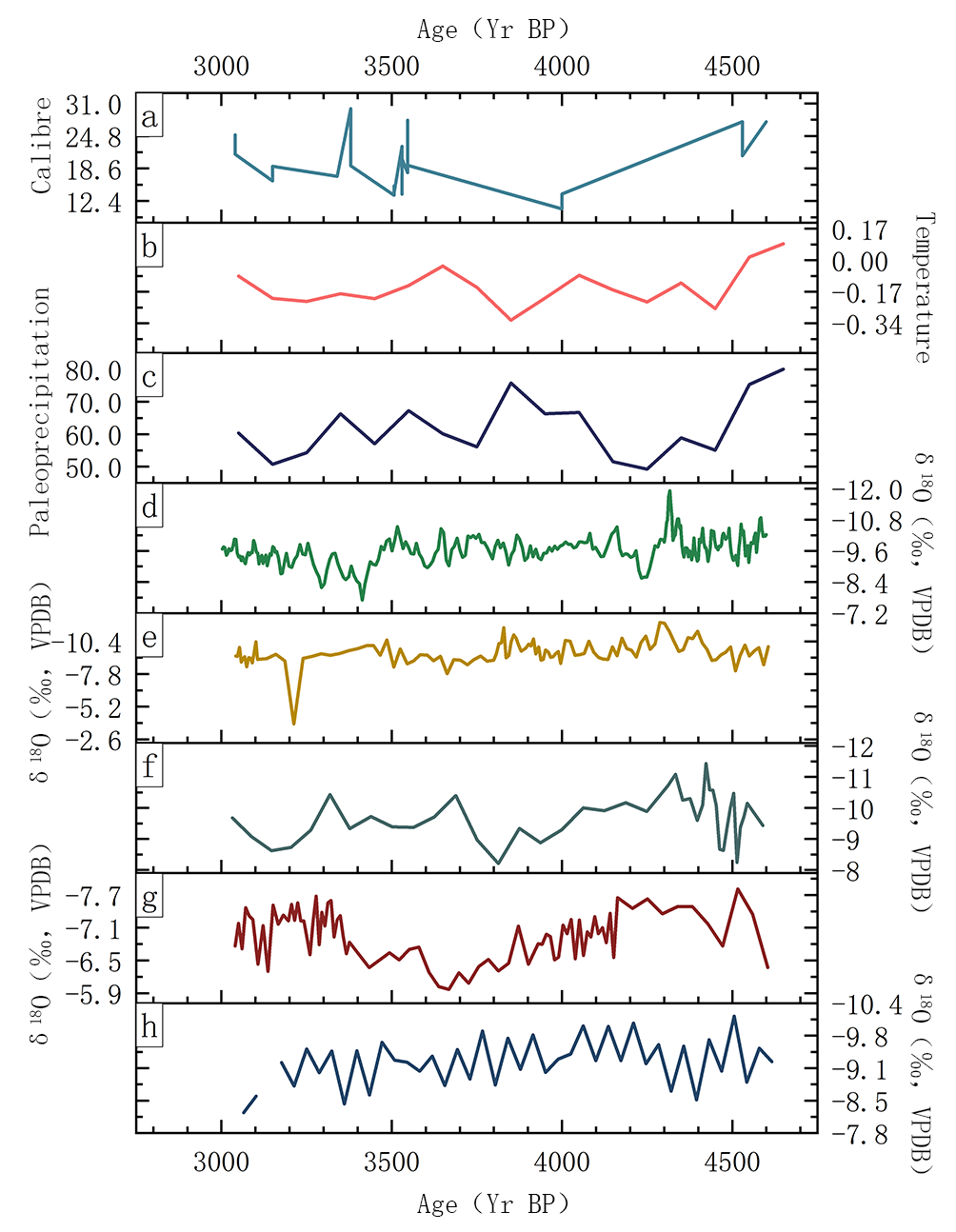 图四.(a)4600-3040aBP中国出土陶水管直径。(b)4600-3040a BP中国温度集成曲线。(c) 4600-3040a BP中国降水集成曲线。(d)河南省马沟洞石笋DSY-1的δ18O记录。(e)陕西省九仙洞石笋C996-1的δ18O记录。(f)陕西省九仙洞石笋C996-2的δ18O记录。(g)陕西省祥龙洞石笋XL16的δ18O记录。(h)山西省莲花洞石笋LH-1的δ18O记录。