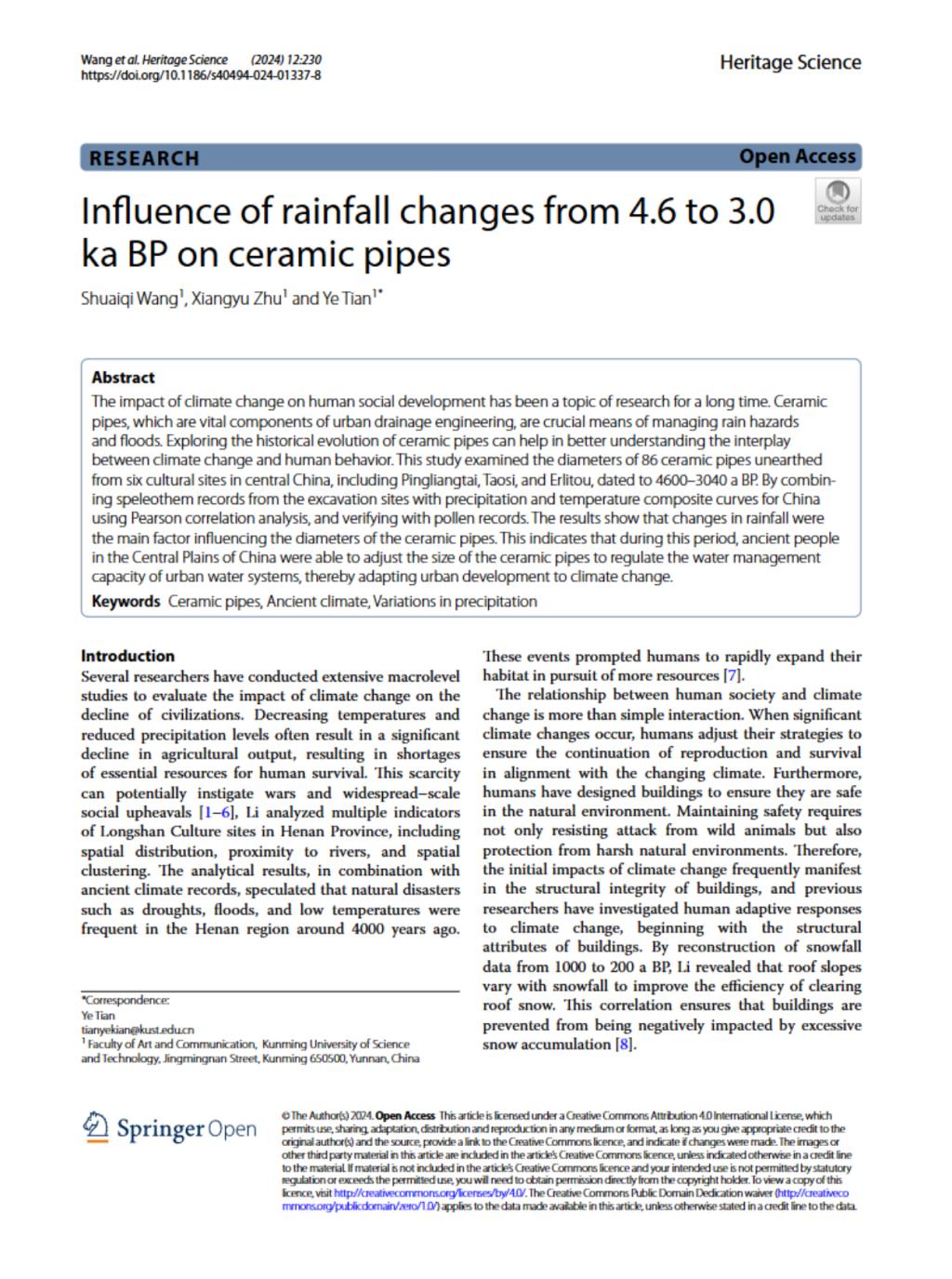 方海教授联合北京大学、清华大学、东南大学、浙江大学、同济大学、广东工业大学、兰州理工大学、阿尔托大学、郑州大信博物馆群等国内外高校、博物馆单位在西南地区共建的研究点,致力于探索“中华设计文化溯源与造物创新”。近期,该研究中心成员设计学专业研究生王帅祺同学、产品设计专业本科生朱翔宇同学,分别以第一作者和第二作者撰写发表的学术论文“Influence of rainfall changes from 4.6 to 3.0 ka BP on ceramic pipes”被国际知名期刊Heritage Science,2024年第12卷,第1期收录,研究中心负责人田野博士为该论文的指导教师与通讯作者,该论文第一署名单位为昆明理工大学。