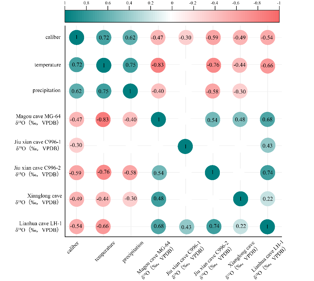 图五.陶水管直径与4600-3040a BP中国华中地区温度模拟结果、降水模拟结果以及石笋δ18O记录的皮尔逊相关性。