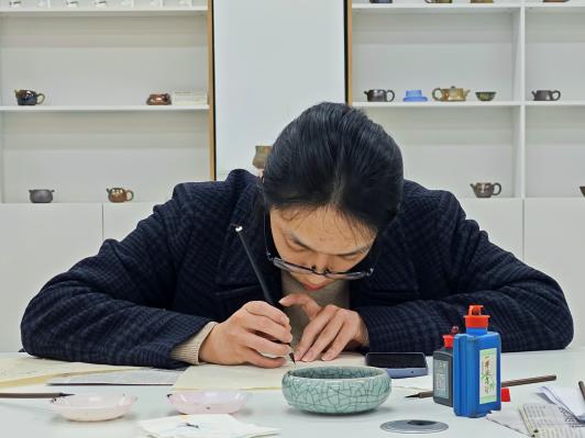 “手腕要稳,呼吸要匀,心要静。”孙鸿雁老师穿梭于学员之间,逐一进行手型指导。初次在瓶内反向作画,笔尖仿佛不听使唤,但这正是内画修炼的必经之路。教室里安静无声,只有细微的笔尖与壶壁摩擦的沙沙声,每位学员都全神贯注,在与自己的耐心和掌控力对话。